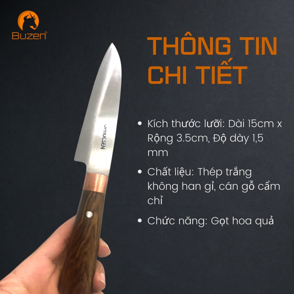 Dao Phúc Sen Chuyên gọt hoa quả dòng Cao Cấp Thép Trắng Không Han Gỉ - Chức năng: Chuyên gọt hoa quả - Kích thước: Lưỡi dài: 15cm, rộng: 3,5cm, dầy: 1,5 li - Lưỡi : Rèn thủ công 100% từ thép trắng không gỉ sét - Cán : Gỗ cẩm chỉ , Khâu và chốt Inox - Bảo hành 12 tháng Nơi sản xuất: Làng nghề dao Phúc Sen, Cao Bằng Phân phối: Công ty TNHH BUZEN ------------------------