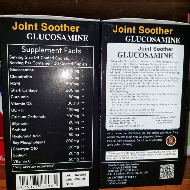 THÀNH PHẦN Viên uống hỗ trợ xương khớp Puritan'S Pride Glucosamin Chondroitin: ✔️Glucosamine HCl. ✔️Chondroitin Sulfate. ✔️MSM (Methylsulfonylmethane). ✔️Hãng SX: Puritan's Pride - Mỹ ✔️Quy cách : Lọ 100viên ☻CÔNG DỤNG Viên uống hỗ trợ xương khớp Puritan'S Pride Glucosamin Chondroitin: ✔️Sản phảm là sự kết hợp của 3 thành phần quan trọng trong việc hỗ trợ cải thiện các chức năng của sụn khớp. Với việc bổ sung các hợp chất có lợi cho xương khớp sẽ giúp cơ thể tái tạo lại các vùng xương khớp bị tổn thương, tái cấu trúc lại các mô sụn khớp, tăng cường sự tiết dịch khớp giúp bôi trơn khớp, tăng cường sự linh hoạt của các khớp từ đó vận động sẽ trở nên dễ dàng hơn. Cùng với sự hỗ trợ thêm của Collagen và Boswelliaserrata giúp xây dựng và hỗ trợ các sụn khớp, thúc đẩy sự khỏe mạnh của sụn khớp. Có thể điểm qua chi tiết một số công dụng như: ✔️Hỗ trợ điều trị các bệ.nh thoái hóa xương khớp, như thoái khớp gối, háng, tay, cột sống, vai, viêm quanh khớp, loãng xương, gãy xương, teo khớp, viêm khớp cấp và mãn tính… ✔️Hỗ trợ phục hồi, bảo dưỡng chất nhờn có tác dụng bôi trơn khớp và các mô khớp, chống lão hóa xương. ✔️Hỗ trợ ngăn ngừa và làm giảm quá trình thoái hoá khớp. ✔️Làm lành các khớp bị tổn thương do vận động mạnh đặc biệt là các chấn thương gặp phải trong quá trình chơi thể thao. ☻HDSD Viên uống hỗ trợ xương khớp Puritan'S Pride Glucosamin Chondroitin: ✔️Uống mỗi ngày 3 viên cùng với bữa ăn hoặc sau mỗi bữa ăn. Sản phẩm này không phải là thuốc và không có tác dụng thay thế thuốc chữa bệnh