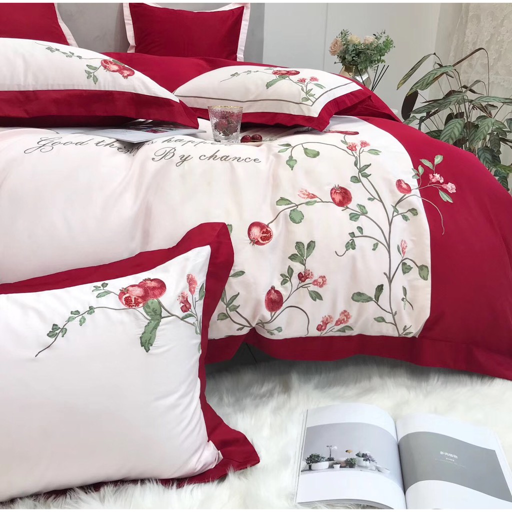 Drap bọc chăn ga lụa cao cấp, thêu Lựu đỏ sung túc và sang trọng