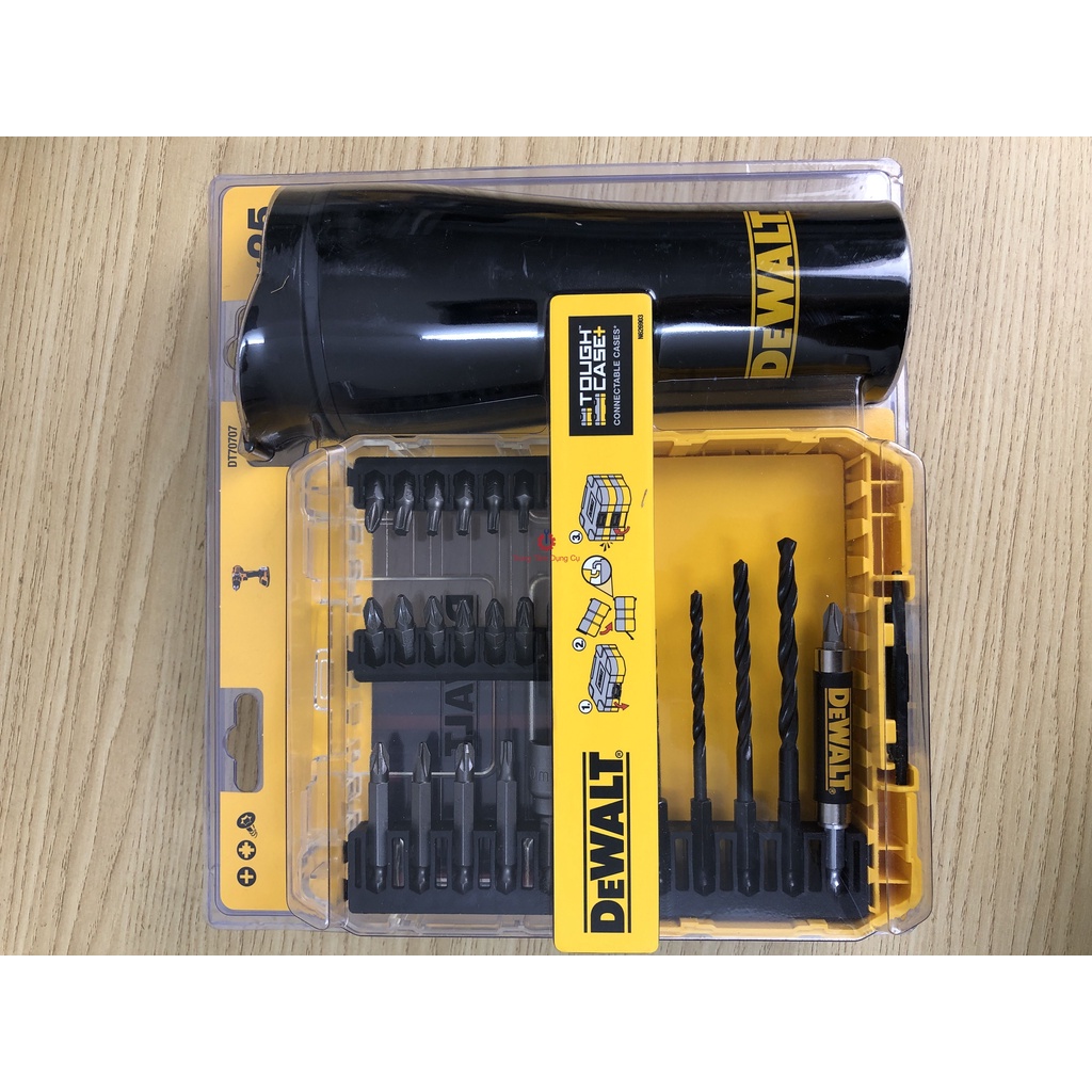DEWALT DT71507-QZ | Bộ mũi khoan vặn vít đa năng Gồm: 4x HSS-G: 4,5, 5,5, 6 và 7mm 2x Phillips 25mm bit: PH2 (x2) 1x rãnh 25mm bit: 6mm bit 7x Pozi 25mm: PZ2 (x5), PZ3 (x2) 6x Torx 25mm bit: T10, T15, T20, T25 (x2), T30 1x Phillips 50mm bit: PH2 2x Pozi 50mm bit: PZ1, PZ3 1x Torx 50mm bit: T25 1x giữ bit tải nhanh 1x 1x nut setter 1x hướng dẫn ổ đĩa từ nhỏ gọn