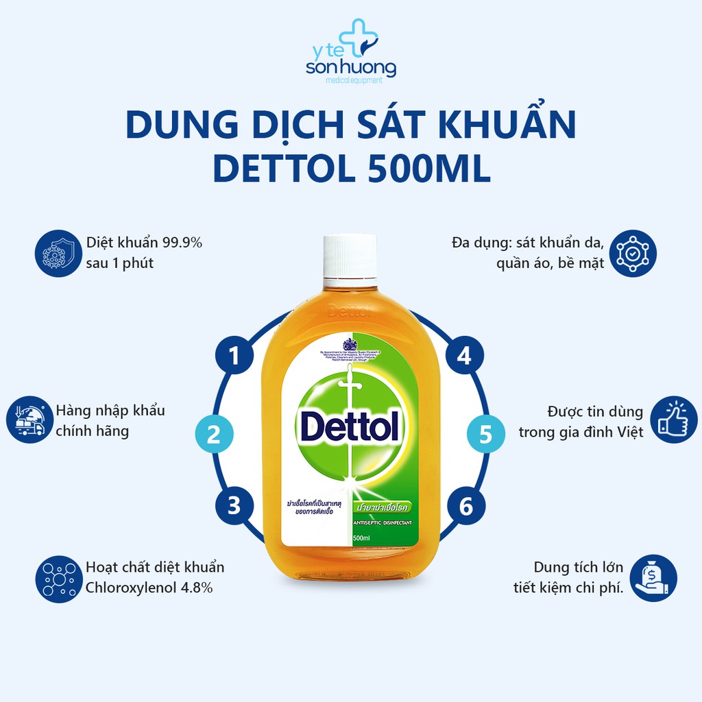 🌈 MỘT DUNG DỊCH KHỬ TRÙNG ĐA CHỨC NĂNG: ∎ Dịch bệnh: Khử trùng đồ dùng bằng vải, sàn nhà và phun khử trùng phòng ở, 1 muỗng canh dung dịch Dettol vào 500ml nước (1 trong 40) ∎ Tắm và giặt quần áo: cho 1 muỗng cà phê dung dịch Dettol vào một xô nước ∎ Sơ Cứu thương: hò