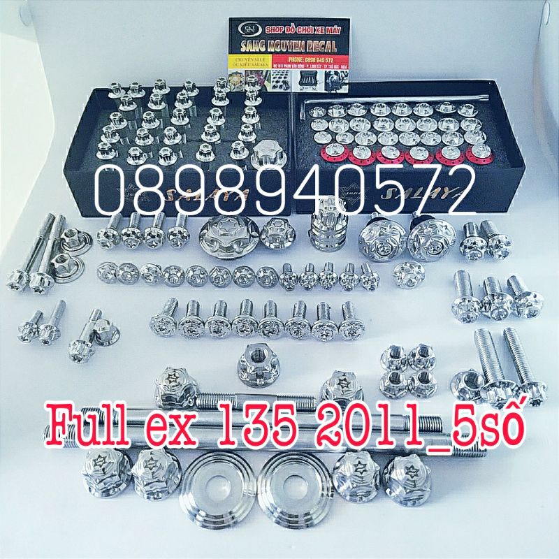 - Mô tả chi tiết sản phẩm gồm: FULL Exciter 135 Ốc lốc máy hai bên 26 con, Ốc dàn áo full bộ 30 con, lông đền màu đỏ 6 cái 1 nắp nhớt, 2 con mâm lửa, 1 chụp giò đạp, 1 cặp gù INOX 304 2 con bát bass heo thắng, trước 1 con bắt bass heo dầu sau 4 tán cùi đĩa nhông