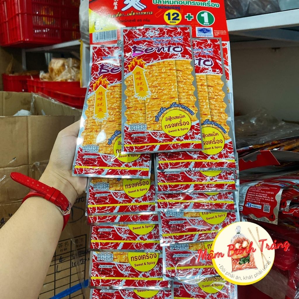 Gói mực Bento Thái Lan snack mực tẩm gia vị cay ngọt Bento - 04100089 Mực Bento là món ăn vặt có nguồn gốc xuất xứ từ Thái Lan. Mực bento được làm từ nguyên liệu chính là mực nuôi công nghiệp với chất lượng mềm, ít dai, thơm ngon chẳng kém gì khô mực tự nhiên. Sản ph