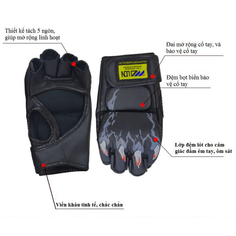 Chất liệu da PU bền chắc, đệm mút lót cao cấp, đàn hồi tốt, dai và độ bền cao. Bảo vệ mu bàn tay và cổ tay người tập khỏi các chấn thương trong luyện võ, MMA, Muaythai… Găng tay MMA wolonthiết kế tối ưu Freesize phù hợp với hầu hết người tập (trên 15 tuổi). Có thể kết hợp sử dụng cùng với băng quấn tay. Chấm hút mồ hôi tốt, thoáng khí. Đường chỉ may chắc chắn, không gây cảm giác khó chịu hay cản trở hoạt động của ngón tay. Găng tay MMA có 2 màu: màu đỏ & màu xanh