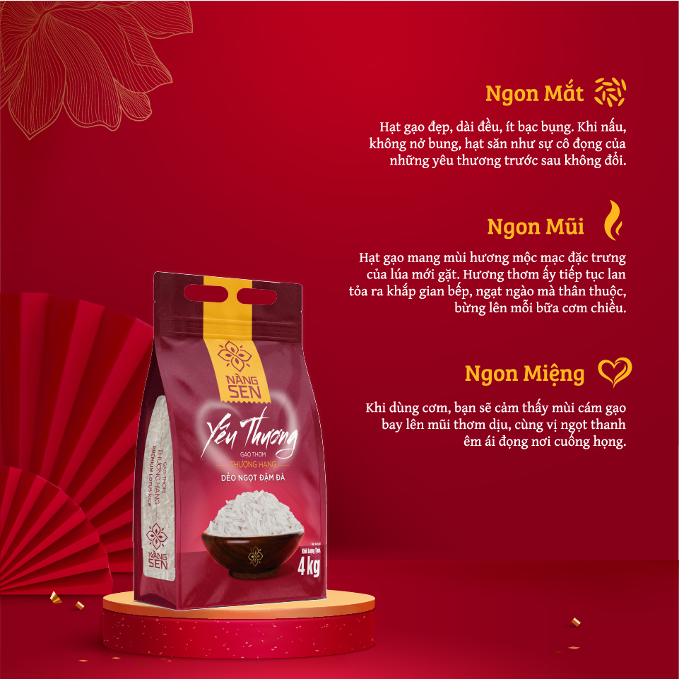 DẺO NGỌT ĐẬM ĐÀ - CAM KẾT GẠO MỚI - KHÔNG NGON ĐỔI GẠO Túi 1kg tiện lợi, có tem dán miệng túi sau khi dùng Nàng Sen là gạo thơm thương hạng dành cho phân khúc cao cấp. Chúng tôi cam kết giống lúa, bao bì đến chứng nhận đạt phẩm chất cao nhất. Và duy trì chất lư