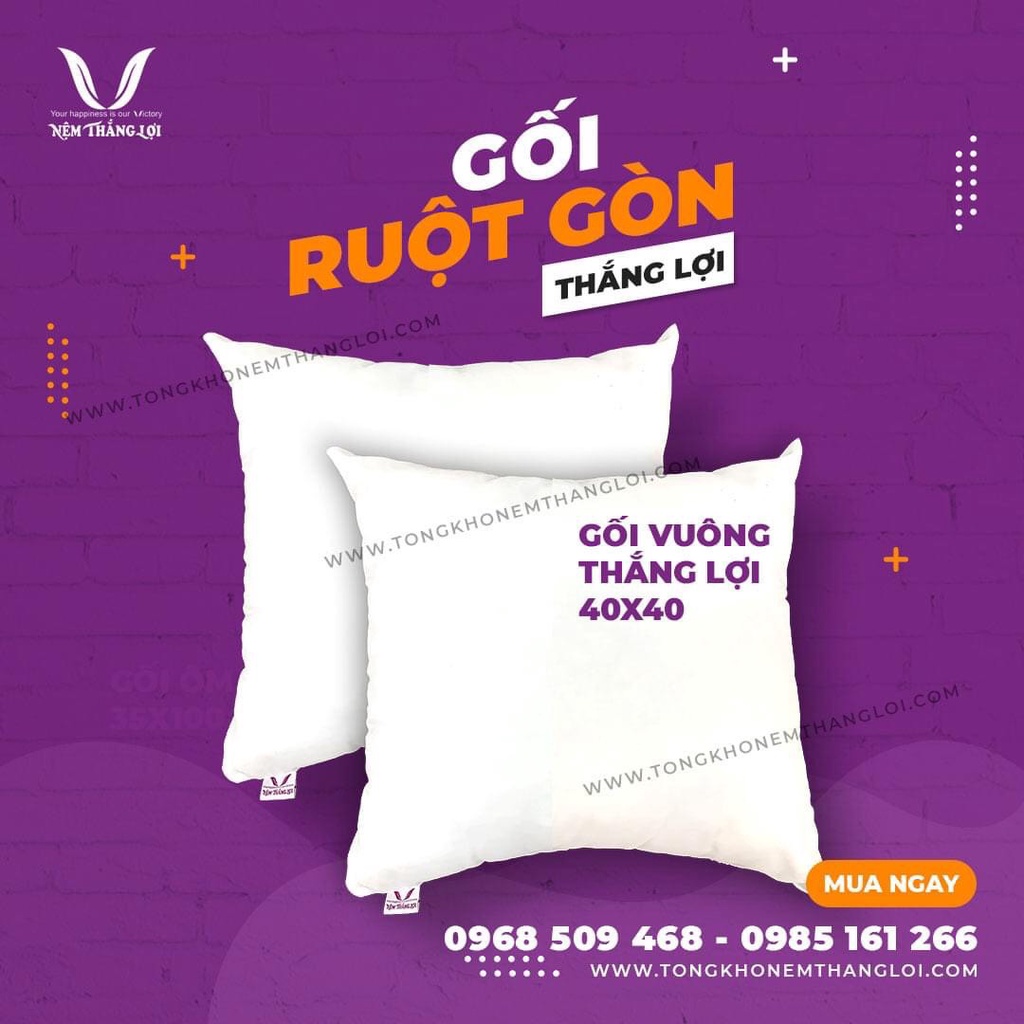 Gối bông gòn Thắng Lợi, Chính hãng,100% polyester do Công ty Thắng Lợi sản xuất. Giặt được bằng tay và máy Ruột gối: gòn 4 chiều, 100% polyester do Công ty Thắng Lợi sản xuất. • Vỏ gối: vải cotton hỗn hợp • gối 40x60 • gối 50x70 • gối 40x40 • gối 30x40 • gối ôm 35x10