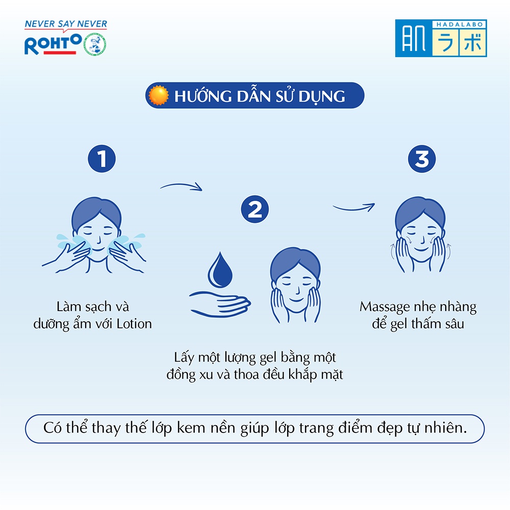 "HADA LABO KOI-GOKUJYUN PERFECT UV GEL (SUNSCREEN) Gel chống nắng dưỡng da ẩm mịn Hada Labo Koi-Gokujyun Perfect Uv Gel (Sunscreen) SPF50+ PA++++ 50g NHẬP KHẨU TỪ NHẬT BẢN Hada Labo là một trong những dòng mỹ phẩm dưỡng ẩm nổi trội tại Nhật trong suốt những năm qua kể từ khi ra mắt, các sản phẩm của thương hiệu Hada Labo đều chứa “Hyaluronic Acid” (HA) một thành phần chủ đạo đóng vai trò quan trọng trong việc dưỡng ẩm, chăm sóc da. Trung bình cứ 4 giây lại có một sản phẩm của Hada Labo được bán ra tại Nhật. Bí quyết của Hada Labo chính là công thức cực kỳ lành tính, không chứa cồn, không dầu, không chất tạo màu, không hương liệu để phù hợp với làn da nhạy cảm. 1. Đặc điểm sản phẩm: - Bảo vệ da tối đa trước tác hại của ánh nắng và dưỡng ẩm hằng ngày cho da. Phù hợp làm kem nền giúp lớp trang điểm đẹp tự nhiên. 2. Thành phần chính: - SPF 50+ PA++++ giúp chống tia UVA/ UVB hiệu quả. - Hệ dưỡng ẩm HA đột phá từ Nhật Bản giúp da ẩm mượt, căng mịn. - Dạng gel mỏng thấm nhanh, thoáng nhẹ trên da. - Phù hợp với mọi loại da. 3. Hướng dẫn sử dụng: Dùng hàng ngày để bảo vệ da tốt nhất. - Bước 1: Làm sạch và dưỡng ẩm da. - Bước 2: Lấy một lượng gel bằng một đồng xu và thoa đều khắp mặt. - Bước 3: Mát xa nhẹ nhàng để gel thấm sâu. Sau khi ra mồ hôi nhiều, thoa lại để có hiệu quả tốt hơn. 4. Lưu ý: - Ngưng sử dụng và tham khảo ý kiến bác sĩ nếu có dấu hiệu dị ứng như: nổi mẩn đỏ, sưng, ngứa. Tránh tiếp xúc trực tiếp với mắt, nếu sản phẩm dính vào mắt, rửa lại ngay bằng nước sạch. Không ở ngoài nắng quá lâu ngay cả khi đang sử dụng sản phẩm chống nắng. 5. Thông tin thương hiệu: - Thương hiệu Hada Labo thuộc Công ty Rohto-Mentholatum (Việt Nam). - Xuất xử thương hiệu: Nhật Bản. - Nơi sản xuất: Nhật Bản. - Ngày sản xuất: Xem chi tiết trên bao bì sản phẩm. - Hạn sử dụng: 4 năm kể từ ngày sản xuất. *Sản phẩm có thể thay đổi bao bì tuỳ theo đợt nhập hàng