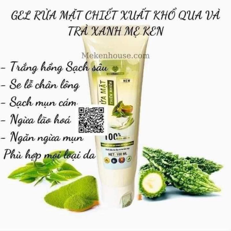 GEL RỬA MẶT THIÊN NHIÊN CHIẾT XUẤT TỪ KHỔ QUA VÀ TINH CHẤT TRÀ XANH MẸ KEN (100ml) *THÀNH PHẦN : Khổ qua, trà xanh, tinh chất hoa cúc, tinh dầu tràm trà, tinh bột nghệ, sáp ong, collagen, vitamin C, Vitamin E,… Đã được sở y tế cấp phép bán ra thị trường. - Hoàn toàn