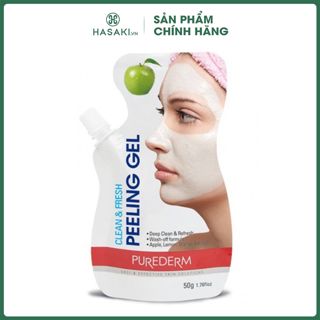 Gel tẩy tế bào chết Purederm Clean & Fresh peeling với thành phần chiết xuất từ trái cây thiên nhiên táo, chanh, cam nhẹ nhàng làm sạch sâu lỗ chân lông, loại bỏ làn da chết và trả lại bề mặt mịn màng tươi trẻ cho làn da, lưu thông máu huyết giúp da hấp thu các dưỡng