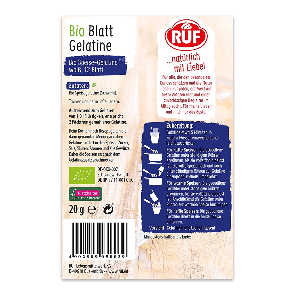 GELATIN LÁ HỮU CƠ LÀM THẠCH RAU CÂU, KẸO DẺO CHO BÉ RUF + Xuất xứ: Đức + Chứng nhận hữu cơ: Châu Âu + Trọng lượng: Túi 20g gồm 12 lá + Hạn sử dụng: Tháng 4 / 2024 ĐẶC ĐIỂM: Gelatin là nguyên liệu quen thuộc trong nhiều món ăn như: Thạch, pudding, panna cotta, cheesec
