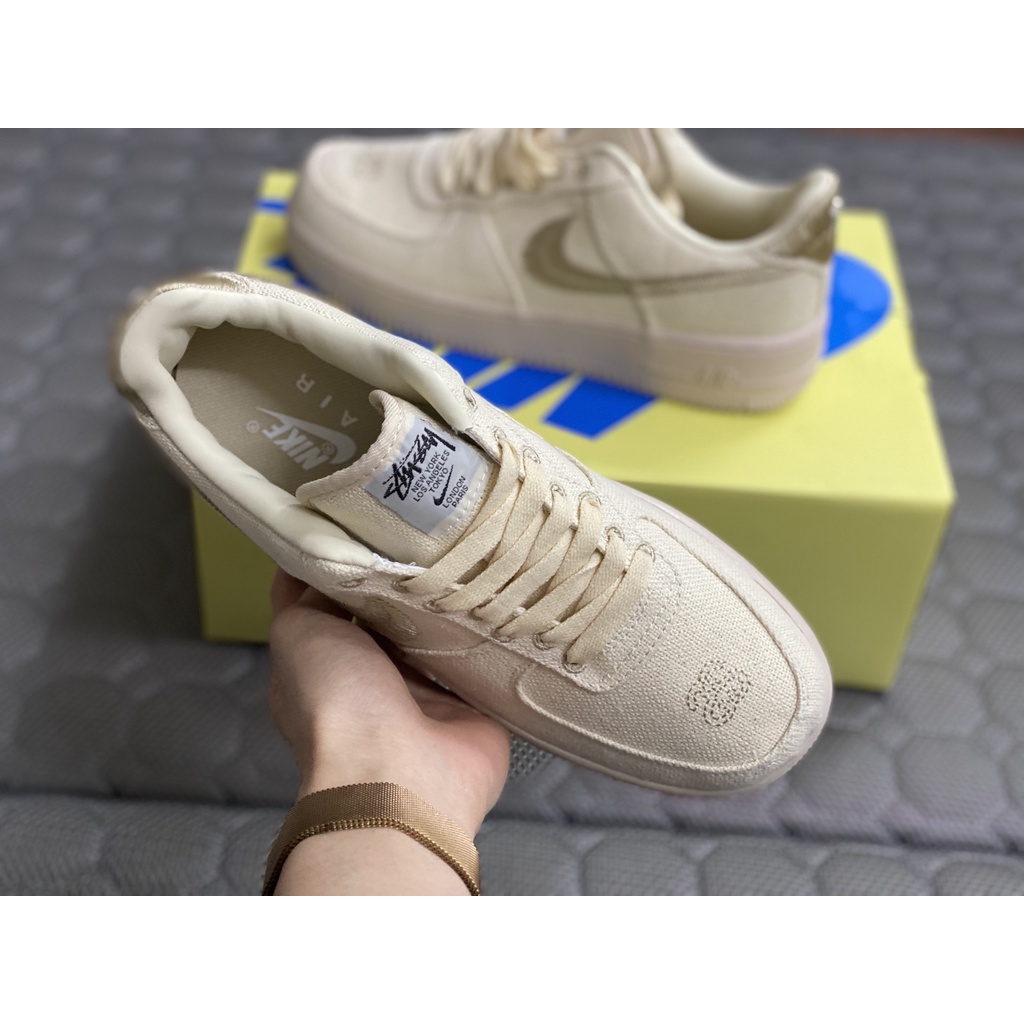 Giày AF1 Low Stussy Fossil, Giày Air Force 1 Stussy Fossil Canvas Kem Siêu Hót 2022 Sẵn Hàng Full Box Bill