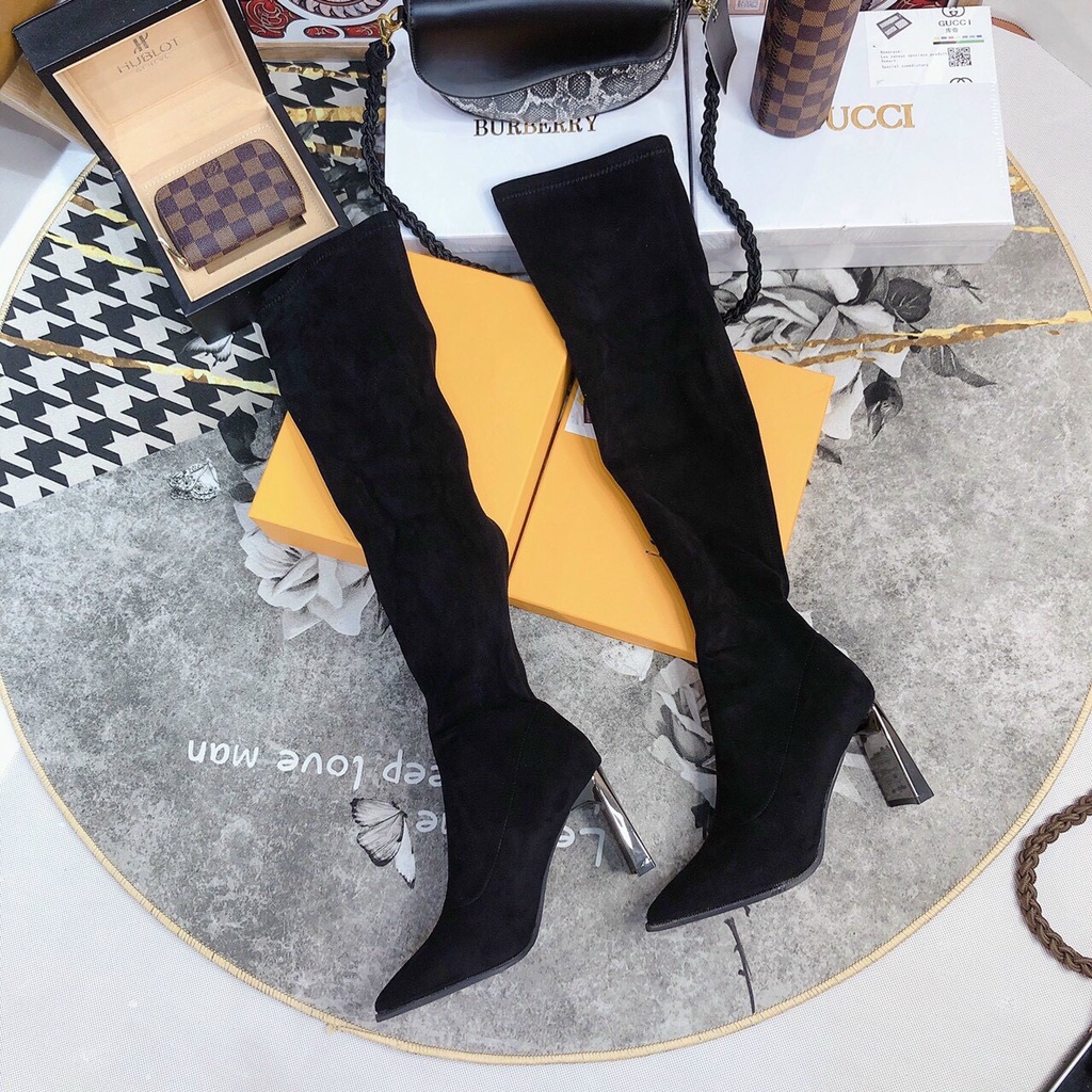 Giày bốt thời trang nữ QC ❤️FREESHIP❤️ Boots đùi nỉ nhung co giãn hot trend mũi nhọn đế vuông 9007-12