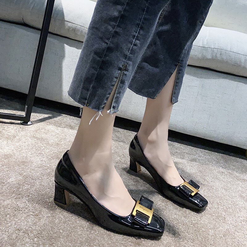 Giày Cao Gót Size 32 33 34 Mũi Vuông Bít Gót Đế Trụ Vuông Cao 5cm Da Bóng