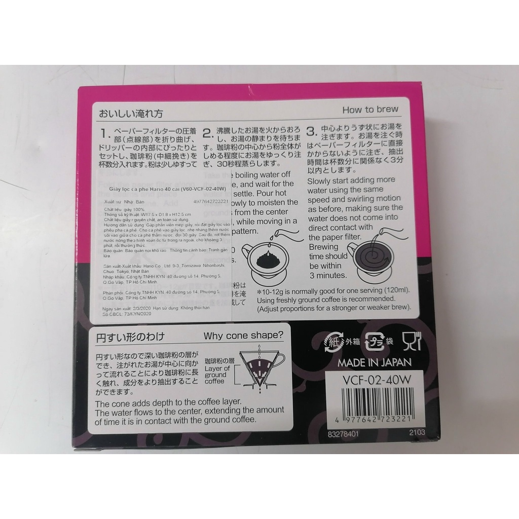 • Xuất xứ: Nhật Bản • Chất liệu: giấy đã qua tẩy trắng • Kích thước: W17.5 x D1.8 x H12.5 • Đóng gói: 40 cái/hộp • Công dụng: Giảm tốc độ chảy khi pha, giúp ly cà phê đậm đà và thơm ngon hơn • Hình quạt , có tính thấm nước cao không bị rách khi gặp nước, có tính năng giữ lại cặn, bã cà phê • + Hướng dẫn sử dụng : • Gấp các cạnh của giấy lọc cà phê để cạnh và đáy theo hướng ngược nhau. • Đưa giấy thấm lọc cà phê thích hợp vào cốc / bình lọc thủy tinh, thêm lượng cà phê bột vào giấy lọc. • Đổ nước nóng theo chiều kim đồng hồ để cà phê ra đều. • Khi cà phê đã nhỏ xuống hết , lấy thấm lọc ra, cho cà phê vào cốc để thưởng thức. • Bảo quản: nơi khô ráo, thoáng mát, tránh ánh nắng trực tiếp, tránh nơi ẩm thấp.