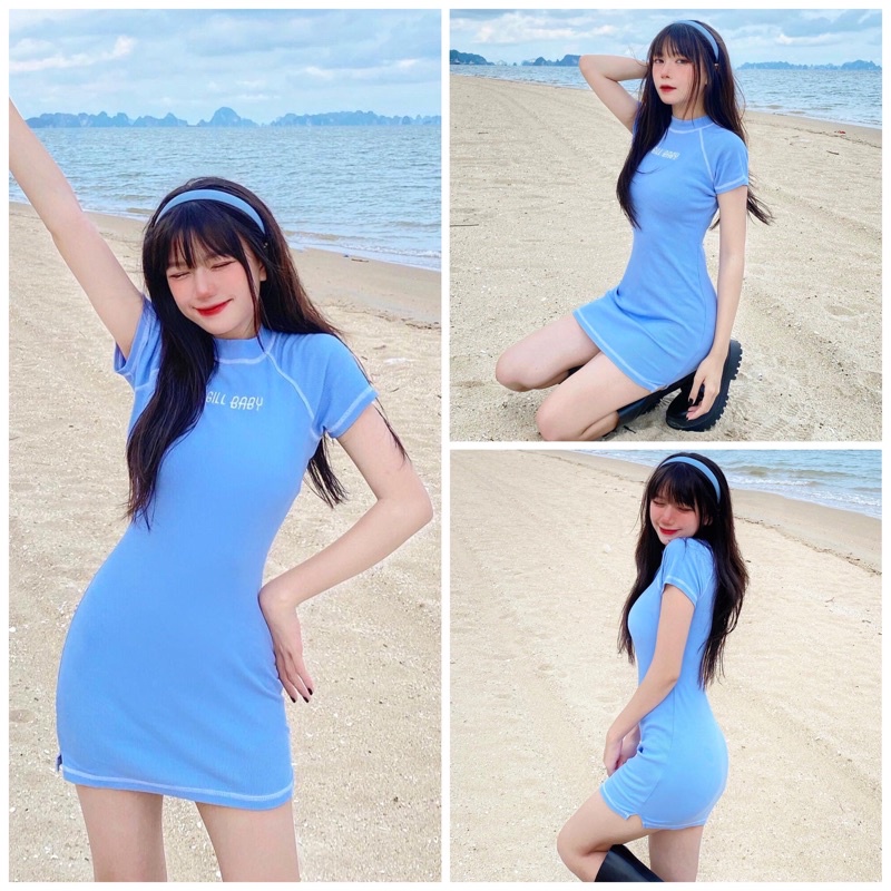 GILLBABY | Đầm body basic tay ngắn chất thun gân logo thêu năng động