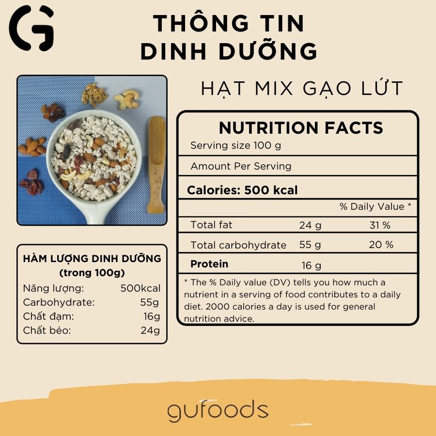 GIỚI THIỆU Granola siêu hạt dinh dưỡng mix gạo lứt ăn kiêng GUfoods là sự kết hợp của bỏng gạo lứt ăn kiêng với nhiều loại hạt ngũ cốc và quả khô healthy, giàu protein thực vật, chất xơ, vitamin, và khoáng chất. Sản phẩm phù hợp với người ăn kiêng, eat clean và giàu l