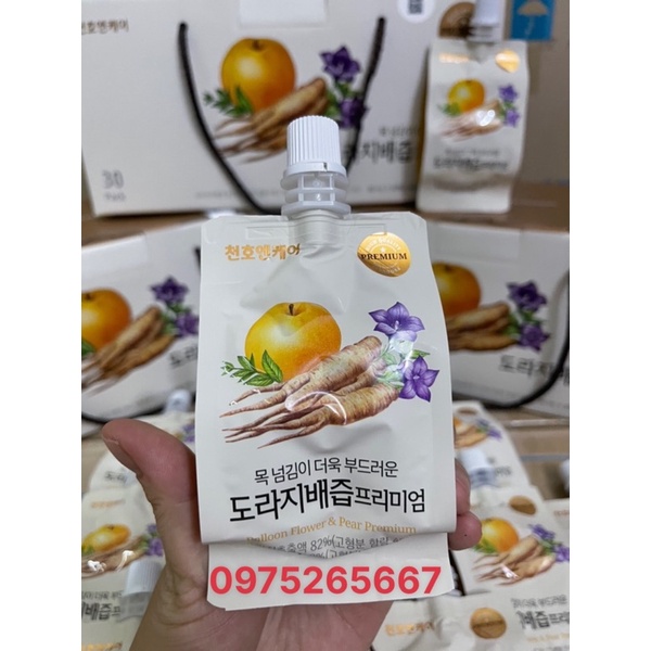 Hồng sâm Hoa lê chuông người lớn Chunho Ncare Nước hồng sâm lê hoa chuông cho người lớn được dân bản địa Hàn Quốc ưa dùng, giúp bảo vệ cổ họng vào các mùa lạnh THÔNG TIN SẢN PHẨM Thành phần: Chiết xuất hoa chuông 74,6 phần trăm (hàm lượng rắn 2 phân trăm), chiết xuất lê 12 phần trăm (hàm lượng cô đặc 68 phần trăm), chiết xuất táo tàu, quả mộc qua Hàn Quốc, kẽm gluconat, vitamin C, công thức hỗn hợp (Nicotinamide, Canxi pantothenate, vitamin B6, vitamin B1, vitamin B2, dextrin, axit folic, natri xitrat, vitamin B12). Công dụng: • Bổ phổi, trợ phổi, bảo vệ vòm họng, đường thở. • Ngăn ngừa viêm phế quản, amidan, đau họng, rát họng. Cắt cơn ho dài ngày, phòng cảm cúm • Tăng đề kháng và nâng cao sức khỏe toàn diện, • Giảm căng thẳng, mệt mỏi, stress Đối tượng sử dụng: Dùng cho nam nữ có độ tuổi từ 20 - 60 tuổi. HDSD • Mỗi ngày chỉ nên sử dụng 1 gói, dùng vào buổi sáng • Bảo quản nơi sạch sẽ, khô ráo, thoáng mát, tránh tiếp xúc trực tiếp với ánh nắng mặt trời. Bảo quản ở nhiệt độ thường 25 độ C - 30 độ C. Quy cách hộp: Hộp 30 gói Xuất xứ: Hàn Quốc. Hạn sử dụng: • 12 tháng kể từ ngày sản xuất. Được in trên bao bì sản phẩm. • Mẫu mã bao bì sản phẩm sẽ thay đổi tùy vào đợt nhập hàng. Lưu ý: • Sản phẩm không phải là thuốc, không có tác dụng thay thế thuốc chữa bệnh. ----------------------- Hashtag: #angellife #hongsam #dekhang #viemhong #tlongdom #camcum #miendich #cangthang #stress