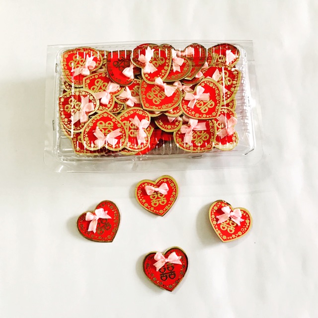 Hộp gồm 100 cái nơ hình trái tim để dán áo cho khách dự đám cưới. Nơ được làm bằng giấy cứng, viền hình trái tim và chữ hỷ in nhũ dập nổi. Có keo dán sẵn.