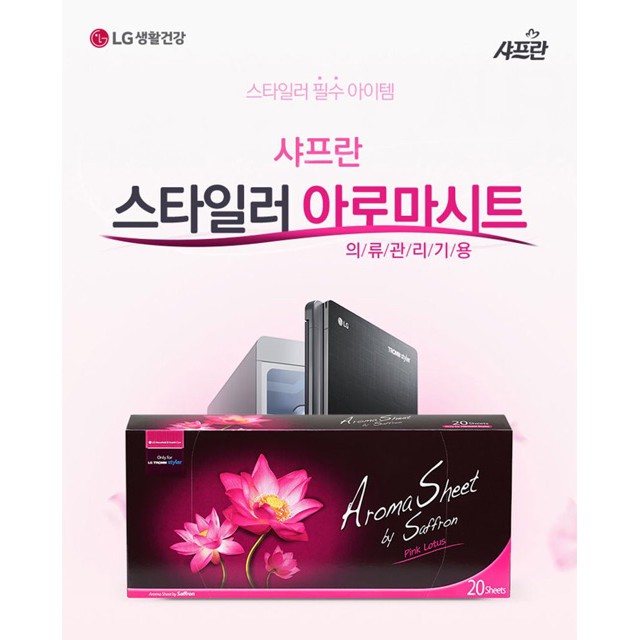 Hộp giấy thơm Aroma Sheet by Saffron chỉ dùng riêng cho máy giặt hấp sấy LG Styler Thông tin sản phẩm - Hãng sản xuất: LG Korean - Xuất xứ: Hàn Quốc - Shop có 2 mùi hương gồm Pink Lotus và Jasmin Blue Hộp giấy thơm có 20 sheet. Nó mang đến hương thơm nhẹ còn lưu g
