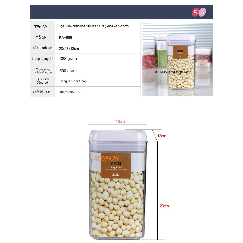 Hộp được làm tự nhựa PP nguyên sinh cao cấp, đảm bảo an toàn VS TP Thiết kế nắp bật dễ dàng thao tác khi sử dụng Kích thước gọn, đẹp phù hợp cho quầy bếp, pha chế. Thông số: + Dạng nắp bật: KT: 22.5 x 14 x 15cm, Dung tích 3 Lít ( khoảng 2kg bột sữa, bột mix..) (n