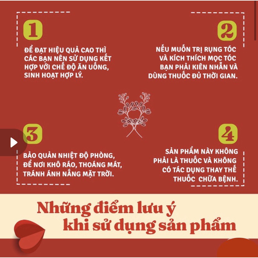 ❤️ NGUYÊN NHÂN DẪN ĐẾN RỤNG TÓC ❤️ - Do chế độ ăn uống thiếu dinh dưỡng, không đủ chất khoáng, vitamin B8 và chất đạm. - Nấm da đầu, tóc dễ gãy, mọc chậm do yếu tố di truyền gen từ bố mẹ truyền cho con cái. - Phụ nữ sau sinh đẻ hoặc khi mang thai bị thay đổi nội tiết tố. Đôi khi bước vào tuổi tiền mãn kinh cũng khiến tóc gãy rụng, khó mọc lại. - Lạm dụng quá nhiều các loại dầu gội, dầu xả, hóa chất nhuộm ép. - Thói quen gội đầu xong không làm khô mà để đầu ướt đi ngủ cũng gây rụng tóc - Nhiều trường hợp bạn phải điều trị một số bệnh bằng thuốc kháng sinh cũng là nguyên nhân gây rụng tóc. - Do áp lực công việc kéo dài, học hành căng thẳng, gây stress, lo lắng, cáu gắt và tổn thương hệ thần kinh. ❤️ THÀNH PHẦN Hà thủ ô (Fallopia multiflora) 120mg Đương quy (Radix Angelicase sinensis) 35mg Thục địa (Radix Rehmanniae) 75mg Ngấy hương (Rabus Cochinchinensis tratt) 50mg Trắc bá diệp (Cacumen Biotae orientalis) 50mg Vừng đen (Sesamum indicum L) 10mg Cỏ nhọ nồi (Eclipta Prostrata L) 37,5mg Nghệ (Curcuma longa) 1mg Vitamin B5 (D-Calcium pantothenate) 1mg Vitamin H (Biotin) 1mcg ❤️ CÔNG DỤNG ✔ Chống rụng tóc hói đầu. ✔ Làm mượt tóc và đen tóc, kích thích mọc tóc. ✔ Ngăn ngừa bạc tọc, khô tóc, tóc chẻ ngọn. ❤️ LIỀU LƯỢNG VÀ HƯỚNG DẪN SỬ DỤNG ❤️ • Liều thông thường 1 viên/ 1 lần, 2 lần / mỗi ngày. • Liều bổ sung nhanh : 2 viên/ lần, 2 lần mỗi ngày. • Nên uống trước bữa ăn 30 phút hoặc sau khi ăn 1 giờ. • Nên sử dụng liên tục một đợt từ 2-4 tháng để có kết quả tốt nhất. *** Đối tượng sử dụng: Dùng cho cả nam và nữ bị rụng tóc, có nguy cơ hói đầu, tóc không chắc khỏe Sản phẩm này không phải là thuốc và không có tác dụng thay thế thuốc chữa bệnh.