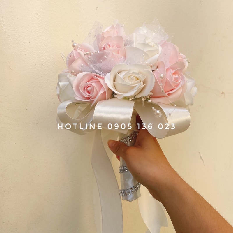 HOA CƯỚI CẦM TAY CÔ DÂU, BÓ HOA SÁP MÀU TRẮNG MÀU HỒNG PASTEL ĐIỂM CƯỜM NGÀY CƯỚI CHỤP HÌNH CƯỚI