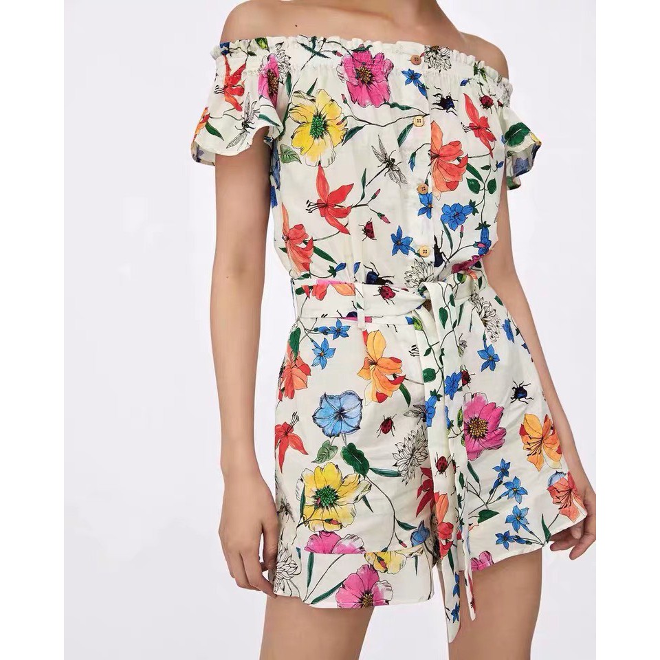 Jumpsuit Zara hoa bẹt vai quá xinh cho ngày hè. Chất vải cát, phần quần có lớp lót, bèo nhún nhẹ trẻ trung. Bạn nào thích chụp hình thì diện bộ này quá xinh ấy. Style ôm eo, quần ống rộng thoải mái tựa cái váy, có thể mặc bẹt vai hoặc ko ạ. Size S M L form eo nhỏ #jumpsuit #zara #moonshopxk #vietnamxuatkhau