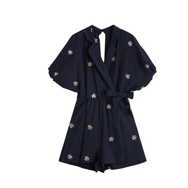 Jumsuit xanh than Zara thêu hoa nhí xinh xắn Sẵn sz XS cho chị em từ 50kg đổ lại nha XS Dài 79 Ngực 92 Eo 60-75 Vai 36