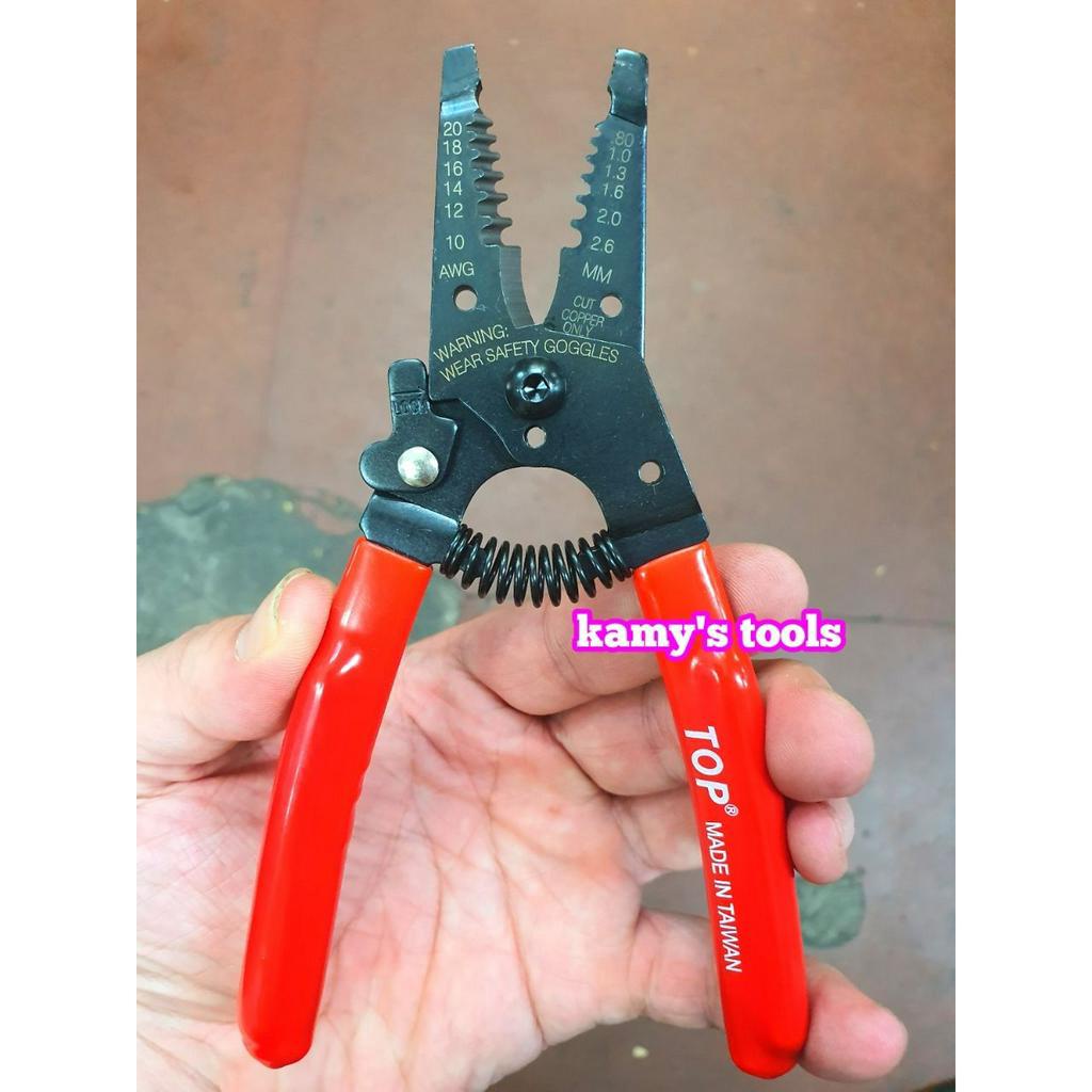 Kìm tuốt cắt dây điện top 6 inch 150mm ly-2028pro chuyên dùng để tuốt dây điện, cắt dây điện với đường kính dây điện từ 0.8mm, 1mm, 1.3mm, 1.6mm, 2mm, 2.6mm với chiều dài là 150mm 6 inch nhỏ gọn cầm gọn trong lòng bàn tay dễ dàng sử dụng. Kìm tuốt cắt dây điện top 6 inch 150mm ly-2028pro được chế tạo bằng hợp kim thép với các phần lưỡi dao tuốt được mài sắc bén chia ra làm nhiều lỗ có đường kính khác nhau được in lên giúp chúng ta biết được đường kính lỗ dây điện nào cần tuốt dây để sử dụng nhanh chóng. Kìm tuốt cắt dây điện top 6 inch 150mm ly-2028pro có phần đầu được làm có răng giúp ra kéo dây điện tốt hơn kết hợp với phần lưỡi dao bên dưới làm sắc bén giúp cắt dây điện một cách hiệu quả. Kìm tuốt cắt dây điện top 6 inch 150mm ly-2028pro có tay cầm được bọc lớp cao su cách điện dày chắc chắn cầm nắm rất êm tay có thể sử dụng lâu mà không bị đau tay.