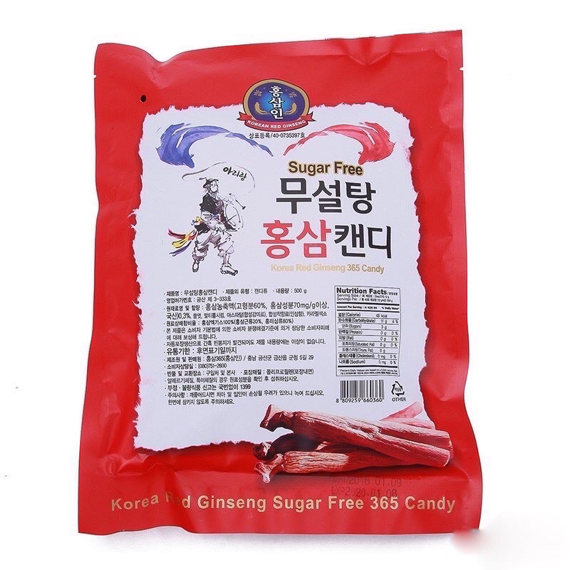Kẹo Hồng Sâm Không Đường Đỏ 365 Candy 500g HSD: 5/6/2023 Xuất Xứ : Hàn Quốc Kẹo hồng sâm Hàn Quốc không đường – SUGAR FREE GINSENG CANDY được sản xuất từ tinh chất Hồng Sâm 6 năm tuổi thượng hạng của Hàn Quốc có khả năng tăng cường sức đề kháng, nâng cao sinh lực, giảm mệt mỏi, căng thẳng, cho bạn một cảm giác thoải mái và vui vẻ. Kẹo Hồng Sâm không đường còn có tác dụng chống lại các vi khuẩn đường miệng nên thích hợp cho cả trẻ em, những người có hệ thống răng miệng kém cũng có thể sử dụng kẹo Hồng Sâm mà không lo sợ bị sâu răng. Kẹo Hồng Sâm Hàn Quốc Loại Không Đường giúp bồi bổ cơ thể và sảng khoái tinh thần, trí lực đồng thời mang lại cảm giác khỏe khoắn. Kẹo hồng sâm không đường Sugar Free Ginseng 365 được cả trẻ con và người lớn đều thích. Bởi vì nó không những thơm, ngon mà còn bổ dưỡng và tốt cho sức khỏe. Kẹo hồng sâm không đường Sugar Free Ginseng 365 giúp cho người bị tiểu đường có thể dùng kẹo ngọt mà không ảnh hưởng đến sức khỏe. Với những người vệ sinh răng miệng kém, khi ăn kẹo không đường lại càng không đáng ngại. Nguyên nhân do thành phần đường trong kẹo có khả năng giúp chống lại các vi khuẩn đường miệng nên thích hợp với cả trẻ em. Thành phần: Corn syrup (corn starch), red ginseng (6 years, domestic, Red Ginseng 70mg / g or more, 60% solids), 1%, xylitol, Ginseng Powder (6 years, Korea) 0.2%, Angelica Extract (58% solids), artificial flavoring (hongsamhyang) CÔNG DỤNG: Kẹo Hồng Sâm không đường với tinh chất hồng sâm, bột hồng sâm Hàn Quốc 6 năm tuổi có tác dụng thư giãn và lấy lại cân bằng tinh thần. Ngoài ra cùng với một số thảo dược tự nhiên giúp cho thơm miệng, chất oligo có trong kẹo giúp tăng cường sức khỏe, chất xylitol làm chắc răng. Giúp thư giãn, sảng khoái tinh thần, đem lại cảm giác khoẻ khoắn, tăng cường sức đề kháng. Bồi bổ cơ thể suy dinh dưỡng, hoạt động và làm việc quá sức. Bổ thần kinh, giảm stress, mệt mỏi, lo lắng, nhức đầu, chóng mặt. Chống lão hoá, kéo dài tuổi thọ, giúp da dẻ luôn hồng hào tươi trẻ. Điều hoà hệ thống miễn dịch giúp chống lại cảm cúm, cảm lạnh và ngộ độc do lạm dụng thuốc khoáng chất. Hàm lượng đường trong kẹo sâm không cao, lại có chất xylitol chiếm tới hơn 50% chất làm ngọt, vì vậy mà bạn có ăn nhiều kẹo sâm một chút cũng không gây sâu răng như các loại kẹo CÁCH DÙNG: Ngày dùng từ 3 – 4 viên Thường dùng chung với trà khi tiếp khách Với những người vệ sinh răng miệng kém, khi ăn kẹo không đường lại càng không đáng ngại. Nguyên nhân do thành phần đường trong kẹo có khả năng giúp chống lại các vi khuẩn đường miệng nên thích hợp với cả trẻ em. Tuy nhiên, cần lưu ý không dùng cho trẻ dưới ba tuổi đề phòng ruột còn yếu. KẸO HỒNG SÂM KHÔNG ĐƯỜNG có thể dùng cho những người bị tiểu đường với liều lượng nhất định. Nên biết rằng, thế phẩm siêu năng lượng của đường trong kẹo chống chỉ định đối với những người mắc bệnh rối loạn thần kinh di truyền (do thiếu một enzime), chứng này có thể phát hiện ngay từ lúc mới sinh.