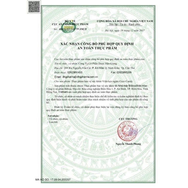 Đối tượng sử dụng: Người lớn và trẻ em trên 6 tuổi. Thận trọng khi sử dụng cho trẻ em dưới 6 tuổi, phụ nữ có thai, người bị bệnh đái tháo đường. Thành phần: Hàm lượng trong 1 viên: Eucalyptol 0.6mg, Tinh dầu gừng 0.6mg, Tinh dầu tần 0.5mg, Tinh dầu quế 1mg, Menthol 7mg, Đường saccharose, mạch nha. Công dụng: Làm ấm và thông họng, thơm miệng. Hỗ trợ giảm ho, đau rát họng và khản tiếng. Hướng dẫn sử dụng: Người lớn và trẻ em trên 6 tuổi: Có thể ngậm kẹo Cozz Candy nhiều lần trong ngày, mỗi lần ngậm 1 viên. Tối đa 20 viên/ngày. Bảo quản: Nơi khô, nhiệt độ không quá 30 độ C, tránh ánh sáng. Quy cách đóng gói: Hộp 100 viên Xuất xứ thương hiệu: Việt Nam Sản xuất tại: Việt Nam Sản phẩm này không phải là thuốc và không có tác dụng thay thể thuốc chữa bệnh.