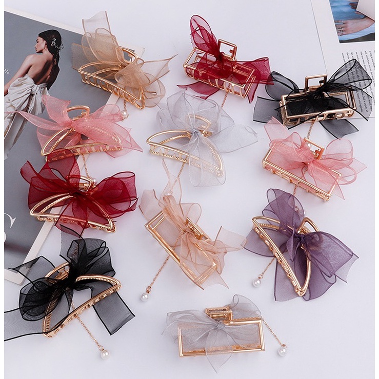 Kẹp tóc kim loại cá mập càng cua hình nơ đính ngọc trai nhân tạo ren Hàn Quốc cặp tóc xinh sang chảnh KT61
