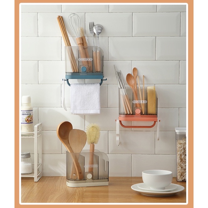 Kệ Đựng Muỗng Đũa Thìa Dán Tường Có Khay Hứng Nước Kèm 2 Móc Treo Và Giá Treo Khăn