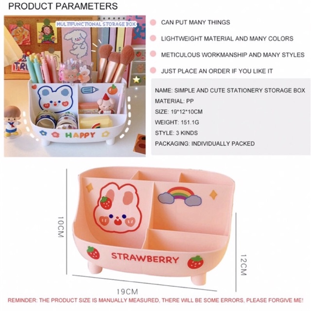 Kệ cắm bút mini, kệ đựng mỹ phẩm đồ trang điểm 6 ngăn nhựa ABS nhiều màu sắc - Tặng kèm Sticker 2D - TiNa’s House THÔNG TIN SẢN PHẨM - Chất liệu: Nhựa ABS cao cấp - Màu sắc: Nhiều màu - Tặng kèm Sticker 2D *Shop xin phép giao đúng màu nhưng hoạ tiết ngẫu nhiên - Kích thước: 19x12x10cm (DxRxC) - Xuất xứ: Trung Quốc ĐẶC ĐIỂM SẢN PHẨM - Kệ cắm bút mini thiết kế nhỏ gọn, tiện lợi phù hợp với không gian, bàn học, bàn làm việc, bàn trang điểm,... - Kệ có 6 ngăn đựng tiện lợi đa dạng kích thước. - Có thể đựng tất cả các loại mỹ phẩm đồ trang điểm như: kem nền, kem dưỡng, son, đồ make up,… - Cấu trúc thiết kế hài hòa, độc đáo mang tính thẩm mỹ. - Màu sắc họa tiết đa dạng, giúp các bé thích thú khi sử dụng. - Sản phẩm có độ bền bỉ cực cao, an toàn với sức khỏe người dùng. HƯỚNG DẪN BẢO QUẢN Bảo quản nơi khô ráo, thoáng mát, tránh nhiệt độ cao. *Lưu ý: Màu sản phẩm có thể sẽ chênh lệch thực tế một phần nhỏ, do ảnh hưởng về độ lệch màu của ánh sáng nhưng vẫn đảm bảo chất lượng. CAM KẾT CỦA SHOP Sản phẩm đúng với mô tả và hình ảnh của shop. Hàng luôn có sẵn, đảm bảo thời gian chuẩn bị tối ưu nhất. Dịch vụ khách hàng luôn tận tâm và nhiệt tình, giúp quý khách có được trải nghiệm tốt nhất khi mua hàng. Đổi trả sản phẩm nếu sản phẩm có lỗi từ nhà sản xuất theo quy định của Shopee. 1. Điều kiện áp dụng (trong vòng 03 ngày kể từ khi nhận sản phẩm): - Sản phẩm phải còn nguyên, chưa qua sử dụng - Sản phẩm hư hỏng do vận chuyển hoặc do nhà sản xuất - Không đủ số lượng như trong đơn hàng. 2. Trường hợp không đủ điều kiện áp dụng chính sách: - Quá 03 ngày kể từ khi Quý khách nhận hàng - Gửi lại hàng không đúng mẫu mã, không phải hàng của shop, mất tag của sản phẩm - Đặt nhầm sản phẩm, chủng loại, không thích, không hợp,… TINA’S HOUSE cảm ơn bạn đã tin tưởng và mua sắm tại shop. Quý khách hàng vui lòng liên hệ trực tiếp với shop để được giải quyết thắc mắc và vấn đề về sản phẩm (nếu có). Mong rằng bạn sẽ hài lòng với sự phục vụ của shop và đừng quên giới thiệu bạn bè của bạn nhé! #ke #cam #but #mini #mypham #trangdiem #6ngan #nhuaabs #mausac #hoatiet #dethuong #dungcu #hoctap #tienloi #nhogon #caocap #chatluong #tinashouse
