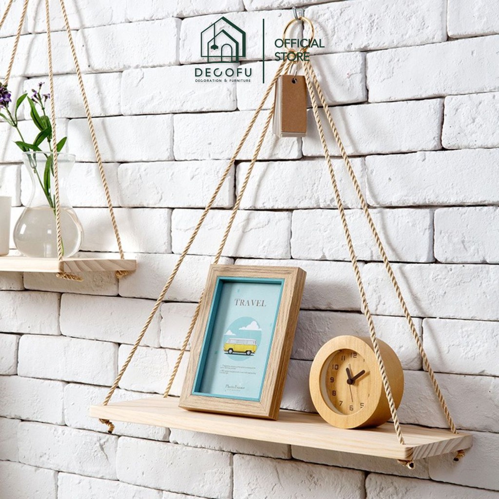 GIỚI THIỆU KỆ GỖ TREO TƯỜNG DECOFU Chất liệu: Gỗ thông tự nhiên Màu sắc: màu gỗ thông tự nhiên Kích thước: 40 x 12 x 1.8cm Bộ sản phẩm gồm: 1 ván gỗ, 2 dây thừng, 1 móc tròn, 1 đinh 3 chân. TÍNH NĂNG KỆ DÂY treo tường DECOFU 1. Làm từ gỗ tự nhiên, nó có một nét duy