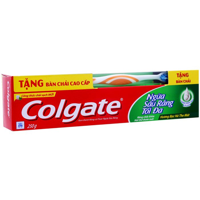 Thông tin sản phẩm Thương hiệu Colgate (Mỹ) Công dụng Ngăn ngừa sâu răng tối đa, hơi thở thơm mát, răng chắc khỏe Hương Bạc hà the mát Khối lượng 250g Sản xuất tại Việt Nam Hướng dẫn sử dụng: Đánh răng sau mỗi bữa ăn hoặc theo hướng dẫn của nha sĩ. Dùng ít nhất 1g ke