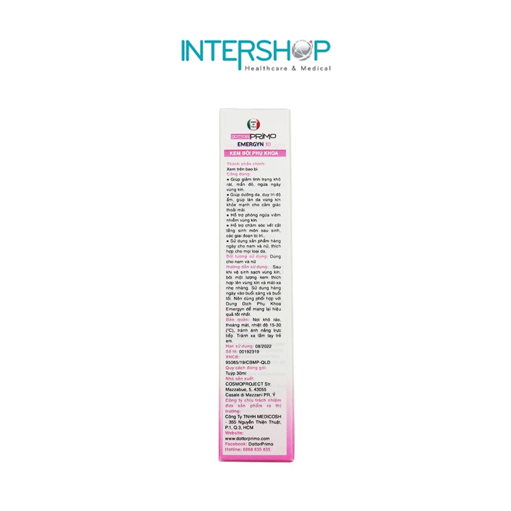 KEM BÔI PHỤ KHOA EMERGYN 10 NHẬP KHẨU TỪ ITALY DottorPrimo Emergyn 10 với công thức độc quyền với hoạt chất chính Neozone 4000 kết hợp với α-bisabolol giúp ngăn ngừa các bệnh phụ khoa thường gặp như nấm ngứa, mẩn đỏ, khô rát, mùi khó chịu và làm dịu tình trạng kích ứng vùng kín. ƯU ĐIỂM NỔI BẬT • Công thức được cấp bằng sáng chế độc quyền tại Châu Âu là sự kết hợp của Neozone 4000, α-bisabolol 1% và 18-β-Glycyrrhetinic Acid 0,1% là công thức tối ưu giúp ngăn ngừa nấm ngứa, khô rát, khử mùi và làm dịu da một cách tối ưu. • Không chứa Corticoid, đã được chứng minh an toàn và hiệu quả trong việc sử dụng cho phụ nữ sau sinh và đang cho con bú • Sử dụng được cho cả nam và nữ, thích hợp cho mọi loại da. CÔNG DỤNG • Giúp giảm tình trạng khô rát, mẩn đỏ, ngứa ngáy vùng kín • Giúp dưỡng da, duy trì độ ẩm, giúp làn da vùng kín khỏe mạng cho cảm giác thoải mái • Chăm sóc vết cắt tầng sinh môn sau sinh, các giai đoạn bị trĩ. THÀNH PHẦN • Neozone 4000 10%: Có tác dụng làm sạch, ngăn ngừa các bệnh phụ khoa thường gặp, bảo vệ các lợi khuẩn, giúp khôi phục độ pH của niêm mạch vùng kín và tái tạo sự cân bằng da • Chiết Xuất Việt Quất và Marigold: Ngăn ngừa các bệnh phụ khoa thường gặp, làm dịu, khôi phục độ pH tự nhiên niêm mạc vùng kín. Giúp tái tạo sự cân bằng da, duy trì độ ẩm của niêm mạc ngoài. • Chiết Xuất Rễ Cây Cam Thảo: Có công dụng ngăn ngừa các bệnh phụ khoa thường gặp. • Cúc La Mã: Làm dịu đa tối ưu, ngăn ngừa các bệnh phụ khoa thường gặp, kích ứng. Tăng cường độ ẩm, chống oxy hóa cực mạnh. ĐỐI TƯỢNG SỬ DỤNG • Nam/nữ gặp các bệnh phụ khoa, nấm ngứa, mẩn đỏ vùng kín... HƯỚNG DẪN SỬ DỤNG • Sau khi vệ sinh sạch vùng kín, rửa tay sạch, cho ra tay lượng gel vừa đủ rồi bôi 1 lớp mỏng vào trong và ngoài chỗ cần bôi. • Nên kết hợp cùng dung dịch vệ sinh phụ nữ DottorPrimo Emergyn để mang lại hiệu quả tốt nhất. • Sử dụng hằng ngày vào buổi sáng và tối. BẢO QUẢN • Bảo quản nơi khô ráo, thoáng mát, nhiệt độ 15-30 độ C, tránh ánh nắng trực tiếp. Tránh xa tầm tay trẻ em. THÔNG TIN THÊM • Xuất xứ: Italy • Nhà sản xuất: Cosmoproject • Địa chỉ: Strada Mazzabue 5 Mezzani, 43058 Sorbolo Mezzani (Parma) - Italy • Nhập khẩu: Công Ty TNHH Intershop • Địa chỉ: 272/6 Nguyễn Tiểu La, P8, Q10, TP.HCM LƯU Ý • Sản phẩm này không phải là thuốc và không có tác dụng thay thế thuốc chữa bệnh. #Emergyn10 #DottorPrimoEmergyn10 #KemBoiPhuKhoa #KemBoiNguaPhuKhoa