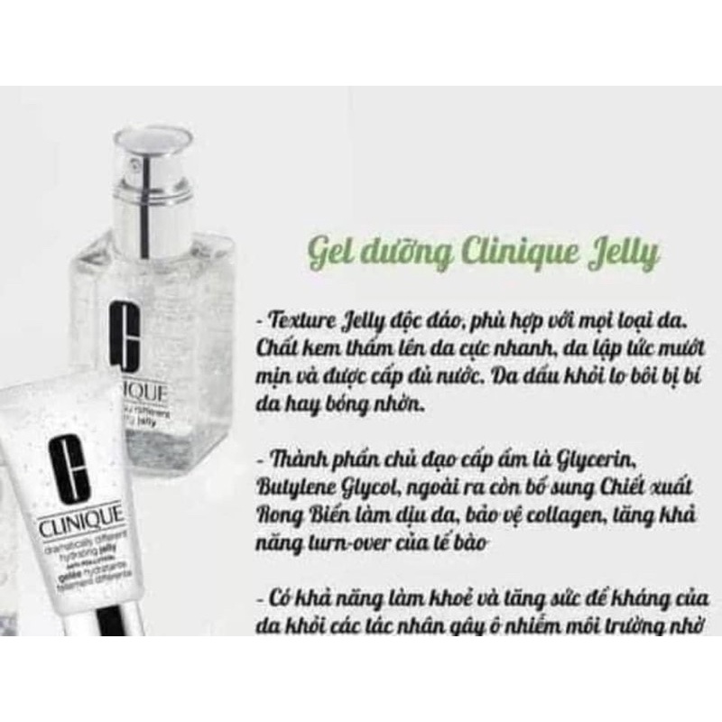 • 𝗖𝗹𝗶𝗻𝗶𝗾𝘂𝗲 𝗛𝘆𝗱𝗿𝗮𝘁𝗶𝗻𝗴 𝗝𝗲𝗹𝗹𝘆 • ❣️Gel dưỡng ẩm Clinique Dramatically Different Hydrating Jelly Công dụng: - Giúp da có được độ ẩm ổn định, giữ da luôn căng mịn - Cân bằng độ ẩm trên da mặt vào tất cả các mùa. - Tạo nên màng bảo vệ trên da rất tốt, tăng khả năng tự phục hồi cho da. - Giúp da mặt có được lớp màng chắn, tăng khả năng lọc và giữ lại những tinh chất tốt cho da. Hạn chế những tác nhân từ môi trường như bụi bẩn, khói bụi làm hại đến da. - Giúp da kháng khuẩn một cách hiệu quả, hạn chế tác động của ánh nắng mặt trời. - Có khả năng kiềm dầu rất tốt. Với da dầu thì dưỡng tối thức dậy sáng sẽ không bị đổ dầu ^^
