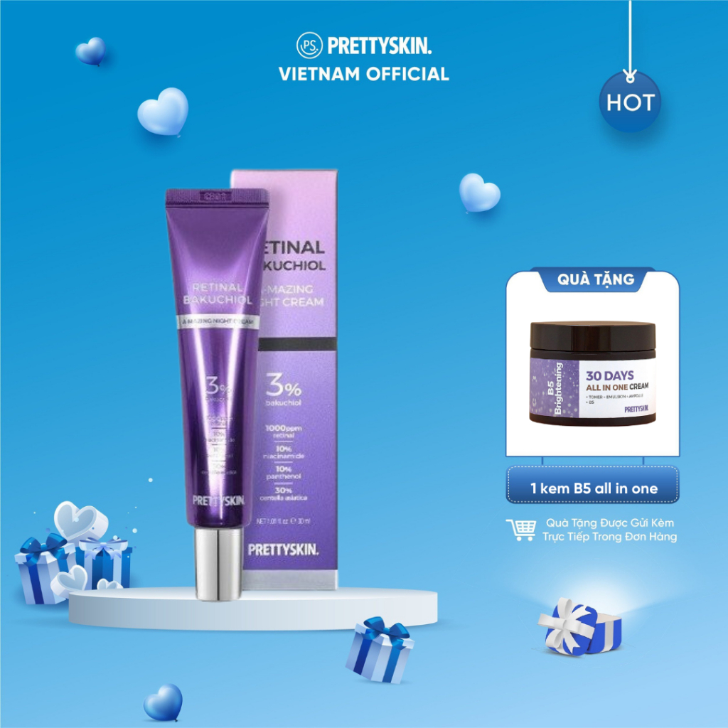 Prettyskin Retinal BakuchiolDung tích 30mlXuất xứ Hàn Quốc#prettyskin #retinal #retinalprettyskin #dadep Trước khi sử dụng kem dưỡng, hãy làm sạch da mặt và cổ bằng sữa rửa mặt hoặc sản phẩm tẩy trang phù hợp. Rửa sạch và lau khô da một cách nhẹ nhàng. Lấy một lượng kem dưỡng khoảng một hoặc hai hoàn toàn tùy thuộc vào kích thước của sản phẩm. Nhấn nhẹ nắp bơm để lấy ra kem. Dùng đầu ngón tay hoặc lòng bàn tay, chấm những điểm kem lên khuôn mặt và cổ, tránh vùng da quanh mắt và môi. Massage kem dưỡng trên da mặt và cổ bằng các cử động nhẹ nhàng và tròn trịa. Massage từ trong ra ngoài và từ dưới lên trên để giúp kem thẩm thấu sâu vào ✅ Chứa Bakuchiol 3% + Retinal tinh khiết 0,1% ✅ 10% B3, 10% B5 tăng cường bảo vệ làn da trước ánh nắng mặt trời, ✅ 30% Centella 👌 Kem dưỡng Retinal Bakuchiol với kết cấu mỏng nhẹ, không mùi hoá chất, thấm nhanh ngay khi thoa lên da, là một siêu phẩm chị em không nên bỏ qua nhé !