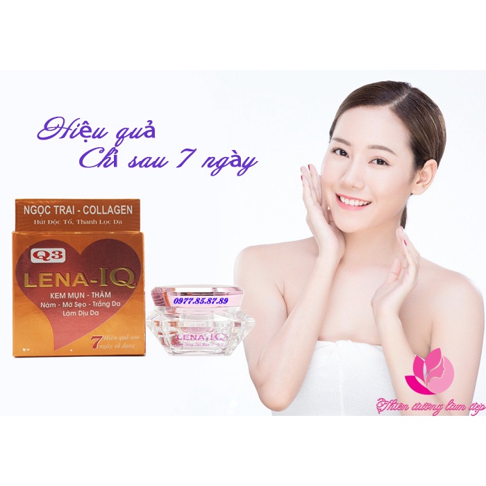 CÔNG DỤNG: - Kem mụn, Thâm, Nám, Mờ sẹo, Trắng da, Làm dịu da Q3 LENA-IQ - 20g có tác dung làm dịu chứng viêm, sưng, nhất là vi khuẩn gây mụn. - Kem có tác dụng ngăn và diệt mạnh hơn, mụn sẽ gôm khô lại trong 8 giờ (khi ngủ). - Kem mụn, Thâm, Nám, Mờ sẹo, Trắng da, L