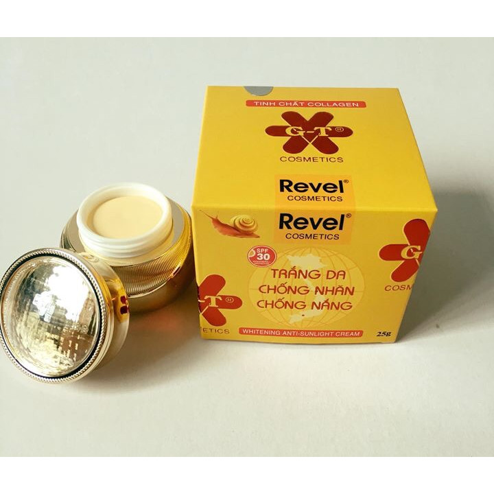 kem REVEL trắng da chống nhăn chống nắng ,với hợp chất vitamin làm cho da sạm đen sần sùi trở nên trắng sáng mịn màng ,Kết hợp với tinh chất colagen xóa và ngăn ngừa nếp nhăn ,làm cho làn da căn bóng...