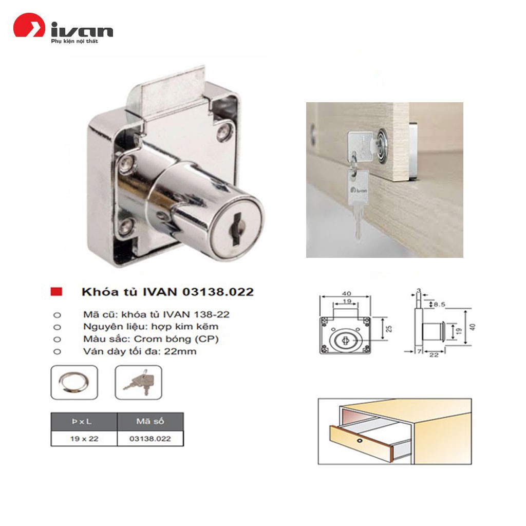 * Công dụng ổ khóa tủ vuông Ivan Ổ khóa tủ vuông có lẻ là dạng khóa tủ thông dụng và ứng dụng đa dạng nhất. Nó có thể được lắp cho nhiều dạng tủ khác nhau. Như tủ dạng mở cánh (một cánh hoặc 2 cánh), hộc tủ, tủ thùng thư, tủ locker gỗ và các tủ cabinet trong các văn phòng công ty. Nên ổ khóa tủ vuông Ivan còn được gọi ổ khóa tủ văn phòng. Ổ khóa tủ vuông IVAN được các thợ lắp đặt ưa chuộng, lựa chọn để lắp đặt cho các sản phẩm để giao cho khách hàng. Vì sự đơn giản, chắc chắc, thẫm mỹ và để dàng lắp đặt. Sau quá trình sử dụng, nếu muốn thay thế thì khách hàng cũng có thể tự mua ổ khóa và tự tay mình thay mà không cần đến thợ. - Màu sắc: Niken bóng (NP) Tâm lỗ khóa đến mép cửa: 25mm Kích thước vỏ khóa: 40x40x7mm Đường kính trụ khóa: Φ19mm, L= 22mm - Nguyên liệu: hợp kim kẽm Thông số ổ khóa tủ vuông Ivan Số chìa có sẳn: 2 chìa Chìa thau vi tính Dạng chìa: chìa răng hai mặt Cửa tủ dầy: từ 1-22 cm Dạng: bên ngoài tròn, bên trong hình vuông Ổ khóa để trong hộp giấy nhỏ, gồm 1 ổ khóa, 2 chìa khóa, khoe. Hộp lớn 12 cái
