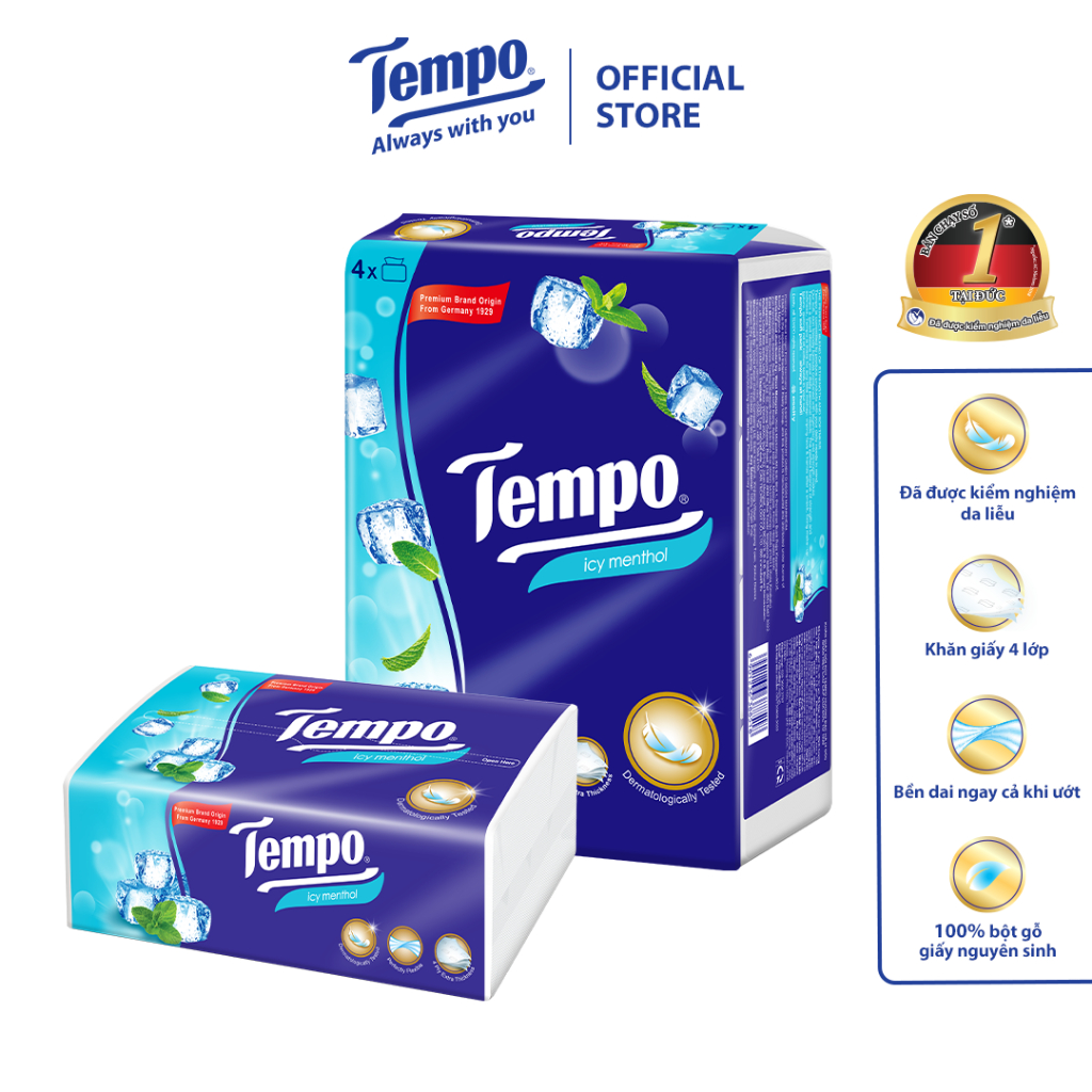 Tempo là nhãn hiệu khăn giấy có xuất xứ Đức từ năm 1929 Được kiểm nghiệm da liễu, an toàn cho da. Khăn giấy rút Tempo Icy Menthol/Neutral (không mùi) được sản xuất theo công nghệ tiên tiến và nguyên liệu đạt chuẩn Châu Âu, không chứa chất độc hại, không gây kích ứng