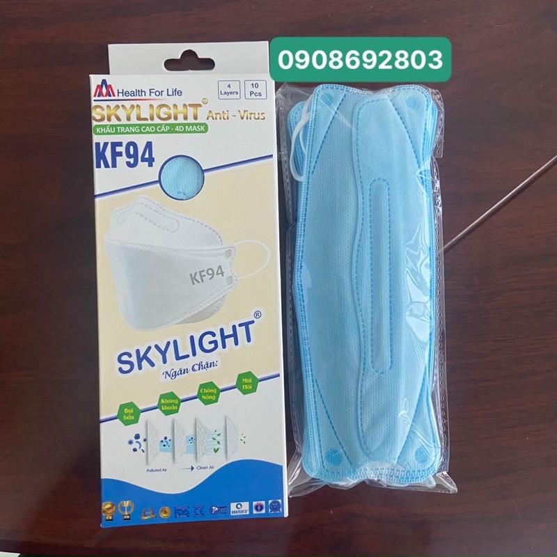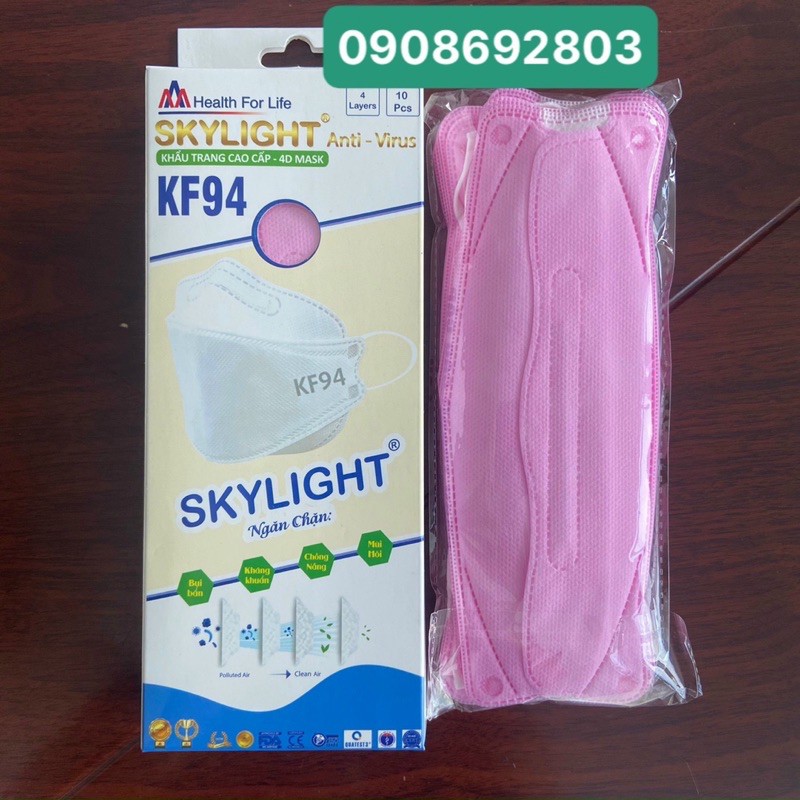 Khẩu Trang 4D ( KF94 ) Landmask Kháng Khuẩn Thương Hiệu : SKYLIGHT Công Ty Sản Xuất : AMIMEXCO - Hàng 4 Lớp , Giấy Lọc Kháng Khuẩn . Quy Cách Đóng Gói : 1 Hộp / 1 Bịch 10 cái ĐẠT CHUẨN XUẤT KHẨU FDA - CE . Gọng kẽm ôm sát mũi , không kích ứng với da nhạy cảm , ô