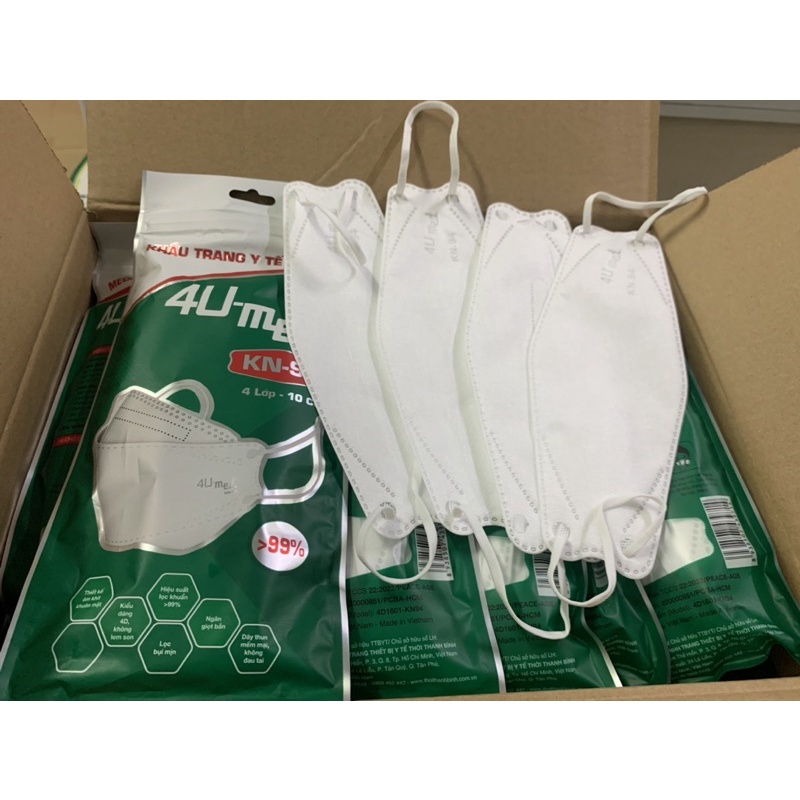 *Thông Tin Sản Phẩm-Thành phần:vải không dệt, lớp lọc, nẹp mũi, dây thu đeo tai-Mục đích sử dụng:Dùng che mũi, miệng. Phòng ngừa, hạn chế khả năng lâ truyền,bảo vệ người dùng khỏi nguy cơ lây nhiễm qua đường hô hấp từ môi trường lân cận, lọc bụi, ngăn giọt bắn. Sử dụng tại bệnh viện, nhà máy, nơi có nhiều khói bụi ô nhiễm MÔ TẢ SẢN PHẨM️ -Thiết kế ôm khít khuôn mặt, khiểu dáng 4D, không lem son, Hiệu suất lọc khuẩn 99% -Lọc bụi mịn, ngăn giọt bắn, Dây thun mềm mại không đau tai Thương hiệu: KN-94 4U-med️Quy cách đóng gói: Thùng 300 cái, gói 10 cái️ Màu sắc: Trắng, Đen, Xanh, Xám