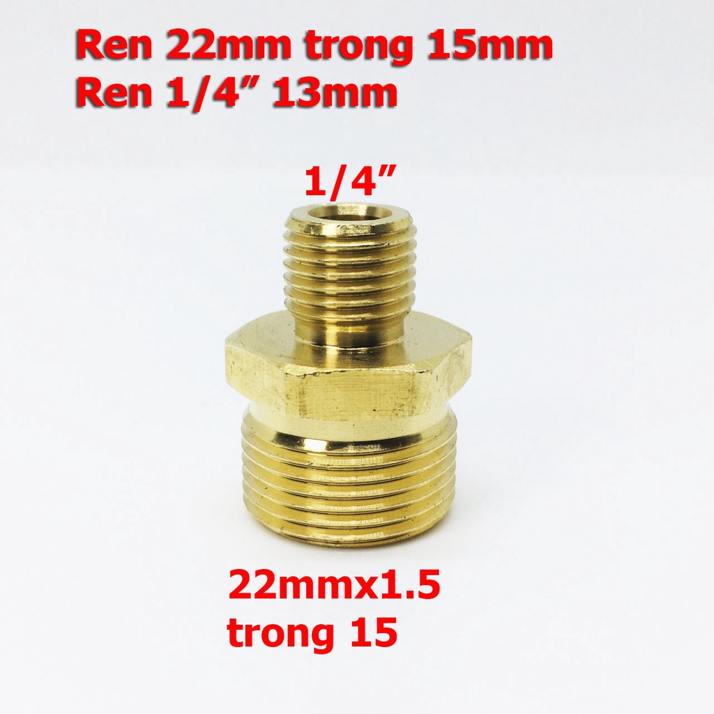 Khớp chuyển ren ngoài 22mm trong 15 sang ren ngoài 13mm (1/4") Thông tin - Chất liêu: đồng thau - Cấu tạo: 1 đầu ren trong 22mm trong 15mm (phù hợp các loại dây xịt máy rửa xe mini gia đình), 1 đầu ren 13mm 1/4inch - Ứng dụng: chuyển đầu dây ren trong 22 trong 15 sang ren ngoài 13mm 1/4" để kết nối béc thông tắc cống và một số đầu béc ren trong 1/4" - Cân nặng: 80gr
