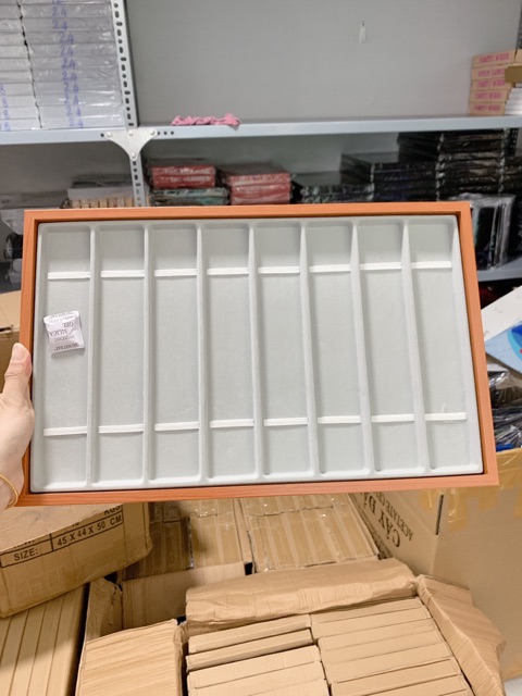 Khay trưng bày đồng hồ / dây da / dây apple watch - Khay gỗ ép , dán viền vân gỗ , bên trong là khay nhựa nhung mỏng , có bản thun giữ dây / đồng hồ ko rớt - Khay chia 8 ô ( shop ko nhập loại 10 ô , vì 10 ô size mỗi ô bị nhỏ , không bỏ vừa đồng hồ nam mặt to ) . Mỗi khay có hộp giấy riêng ✌️✌️ Hình thật shop tự chụp , hàng xịn đét nha mấy bạn * Bạn ở HCM hãy chọn Grab và NowShip để nhận hàng trong 30p-2h ! 💋💋 👌👌 RUBYHOUSE68 - Cam kết chất lượng chuẩn cho từng sản phẩm bán ra - Đổi trả ngay lập tức nếu sp có lỗi do shop hay do vận chuyển KHÔNG NÓI NHÌU 👍👍