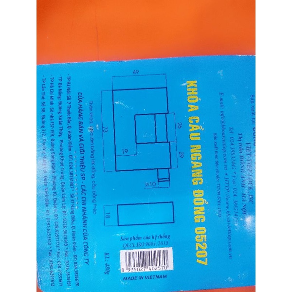 Sản phẩm ổ khóa cầu ngang thuộc thương hiệu Việt Tiệp Khóa cầu ngang đồng Việt Tiệp có càng nằm ngang nên rất khó cắt, nước mưa không rơi vào ổ khóa, đặc biệt không bị gỉ sét do các tác nhân bên ngoài. Thông tin sản phẩm: Tên sản phẩm: Ổ khoá cầu ngang Việt Tiệp Tr