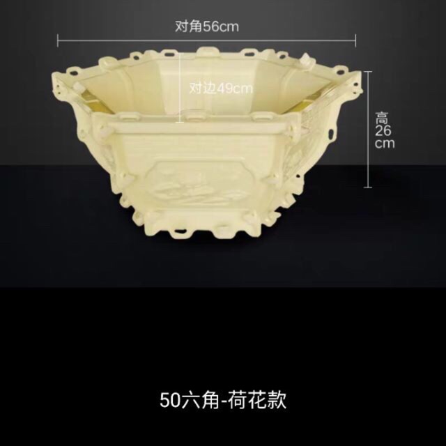 Khuôn đổ chậu cảnh lục giác 50 Kích thước : miệng rộng 50cm cao 26cm Hoạ tiết tùng và sen xen kẽ Chất liệu: nhựa abs Cấu tạo một khuôn gồm: 6 mảnh thân ngoài , 1 tấm đáy và 1 lòng trong liền khối Khách hàng muốn tìm hiểu thêm về sản phẩm vui lòng liên hệ: 0392 059 768