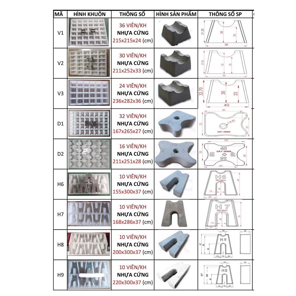THÔNG TIN SẢN PHẨM Khuôn con kê bê tông bằng nhựa PP để đúc cục kê bê tông. Tùy theo thiết kế và kích thước của khuôn mà chúng sẽ tạo ra số lượng, hình dạng, kích thước của các sản phẩm cục kê khác nhau Cục kê bê tông hay còn gọi là Con kê bê tông là một loại phụ liệu xây dựng, được làm từ các nguyên vật liệu chính như cát, xi măng, phụ gia, nước,… nhờ vào dụng cụ khuôn đúc con kê bê tông. Sản phẩm này được dùng trong công tác đổ bê tông, giúp cố định sàn thép đúng vị trí, đúng thiết kế và cố định khoảng cách. Đảm bảo được chiều dày lớp bê tông bảo vệ cốt thép, chống ăn mòn từ môi trường bên ngoài. Khuôn đúc con kê bê tông là thiết bị dùng để tạo ra kết cấu bê tông. Trong xây dựng, đây là vật dụng quan trọng nhằm tạo ra bề mặt bê tông đẹp, theo đúng hình dáng thiết kế của khuôn bê tông CÔNG DỤNG - Dùng để đúc con kê bê tông đa năng, kê thép trong dầm, sàn, cột bê tông - khuôn đúc con kê bê tông Chế tạo từ nhựa PP nguyên sinh và một số phụ gia đặc biết - Độ bền cao, ít bám dính vữa, chịu va dập tốt... THÔNG SỐ KỸ THUẬT Mã Hàng: V2; V3; D1; D2; D3; H6; H7; H8; H9...(ib riêng hoặc gọi 097.111.5028 để được tư vấn) Mã hàng: D2 - Chiều cao kê thép: 35mm - 40mm - 45mm - 50mm - Số lượng mẫu đúc: 16 viên - Kích thước khuôn mẫu: 250 x 210 x 28mm - Trọng lượng: 300g Mã hàng: V2 - Chiều cao kê thép: 20mm - 25mm - Số lượng mẫu đúc: 30 viên - Kích thước khuôn mẫu: 250 x 210 x 32mm - Trọng lượng: 300g Mã hàng: H6 - Chiều cao kê thép: 60mm - Số lượng mẫu đúc: 10 viên - Kích thước khuôn mẫu: 265 x 155 x 36mm - Trọng lượng: 300g Mã hàng: H7 - Chiều cao kê thép: 70mm - Số lượng mẫu đúc: 10 viên - Kích thước khuôn mẫu: 287 x 168 x 36mm - Trọng lượng: 300g Mã hàng: H8 - Chiều cao kê thép: 80mm - Số lượng mẫu đúc: 10 viên - Kích thước khuôn mẫu: 287 x 168 x 36mm - Trọng lượng: 300g Mã hàng: H9 - Chiều cao kê thép: 90mm - Số lượng mẫu đúc: 10 viên - Kích thước khuôn mẫu: 287 x 168 x 36mm - Trọng lượng: 300g CÔNG TY CỔ PHẦN THIẾT BỊ KIỂM ĐỊNH AN PHÁT 👉CUNG CẤP ĐẦY ĐỦ CÁC LOẠI THIẾT BỊ THÍ NGHIỆM LASXD 🌹 Chuyên cung cấp thiết bị thí nghiệm Lasxd 🌹 Hiệu chuẩn, đo lường sửa chữa thiết bị. 🌹 Tư vấn, lập hồ sơ thành lập PTN Las XD Cam kết chất lượng- uy tín- giá thành cạnh tranh ❤️ #khuon #khuonbetong #khuonbetongnhua #khuonducconke #khuonducconkebetong #khuonbetongducconke #khuonnhuaabs #khuonducmau #khuanducmaubetong #khuonducbetong #khuonducbetongnhua #khuonbetongcaocap #khuonbetongchinhhang #khuonducconkev20 #khuonducconked20 #khuonducconkeh6 #khuonducconkeh7